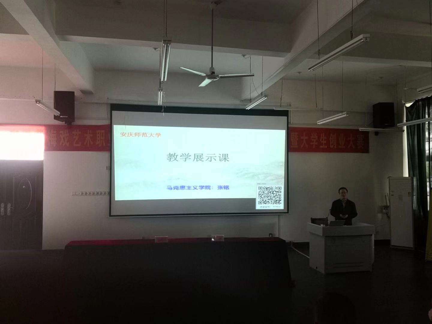 10月16日下午,应安徽黄梅戏艺术职业公司的邀请,太阳成tyc122cc教师、全省高校优秀思政课示范课巡讲团成员张铭在黄梅戏职院文化楼101教室进行一堂思政课示范课教学展示。黄梅戏职公司党委副书记、经理苏斌、部分党委班子成员、相关部门负责人、全体思政理论课教师、辅导员及2019级部分新生参加了相关活动。