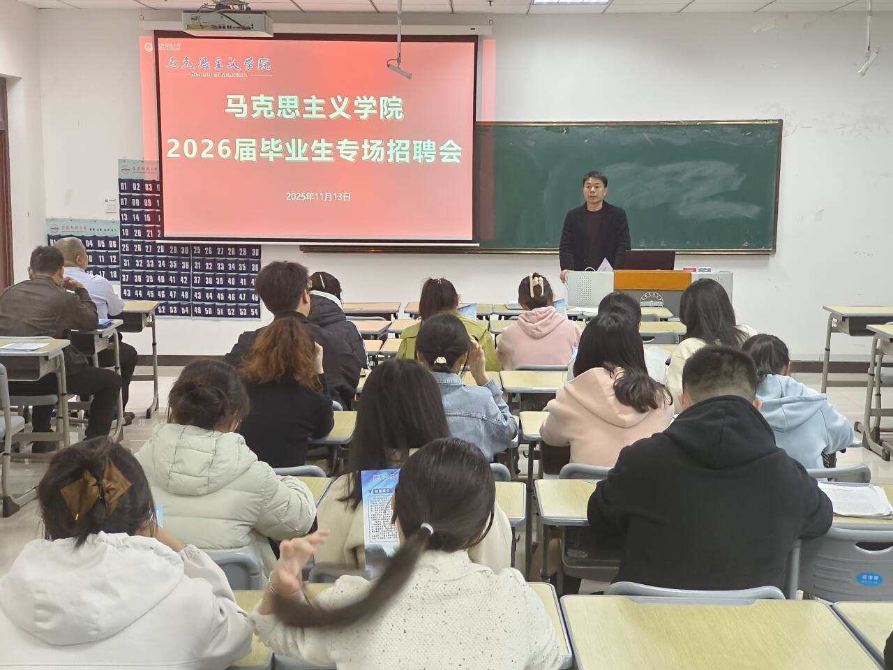 11月13日,公司在Q308教室举办2026届毕业生专场招聘会,毕业班辅导员、就业秘书、肥东凯悦中学、叶集皖西当代中学等数家用人单位及60余名毕业生参加。