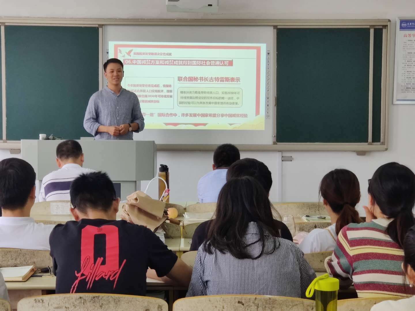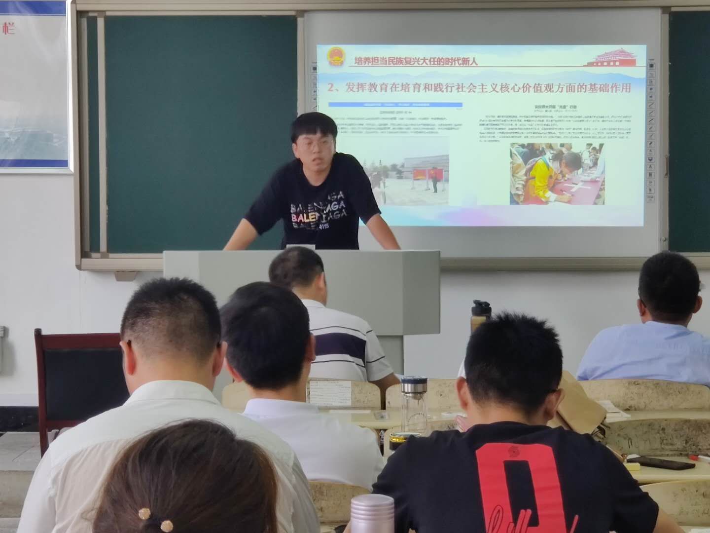 在研讨环节上,大家进行了热烈的讨论,他们赞扬三位老师授课状态饱满,课件制作精美、内容设计翔实,教学方法生动,互动良好。同时,一些教师也分享自身的教学心得。比如恰到好处地应用抖音等网络微视频,实现课程“顶天”和“立地”相结合,做到政治性和学理性相统一,真正了解员工的困惑和需要所在,画龙点睛地设计黑板板书等。