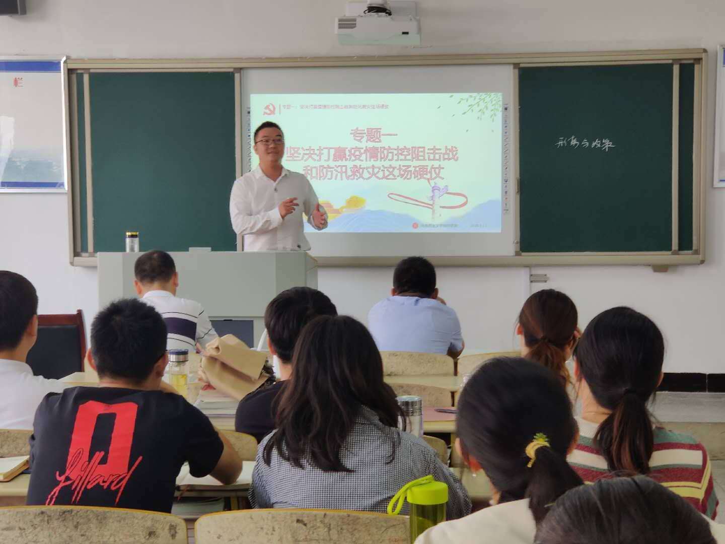 备课会上,李俊、田梦甜和汪健三位老师分别围绕“坚决夺取脱贫攻坚战全面胜利——全面建成小康社会与中国道路”、“坚决打赢疫情防控阻击战和防汛救灾这场硬仗”和“培养担当民族复兴大任的时代新人——坚持把立德树人作为根本”专题作公开课教学展示。李俊老师运用可视化的方法展示十八大以来我国脱贫攻坚取得的显著成就;田梦甜老师结合疫情防控和防汛救灾的感人事例讲解伟大的抗疫和抗洪精神;汪健老师运用细、小、实接地气的方式宣讲习近平总书记关于教育的重要论述。三位老师的公开课展示精彩纷呈,引来了听课教师的阵阵掌声。