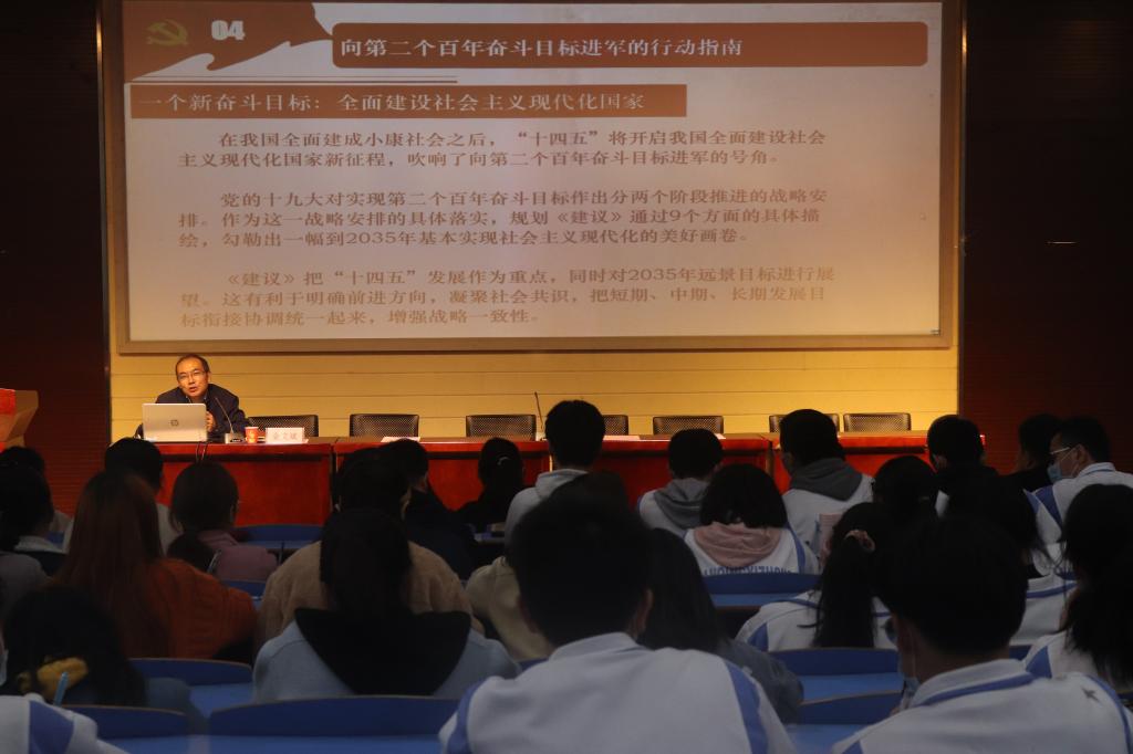 开班仪式结束后,金文斌为公司“青马班”学员和安庆一中师生代表作了“学习贯彻党的十九届五中全会精神”辅导报告。他从党的十九届五中全会的基本情况、重要意义、主要内容以及向第二个百年奋斗目标进军的行动指南等四个方面展开了解读。