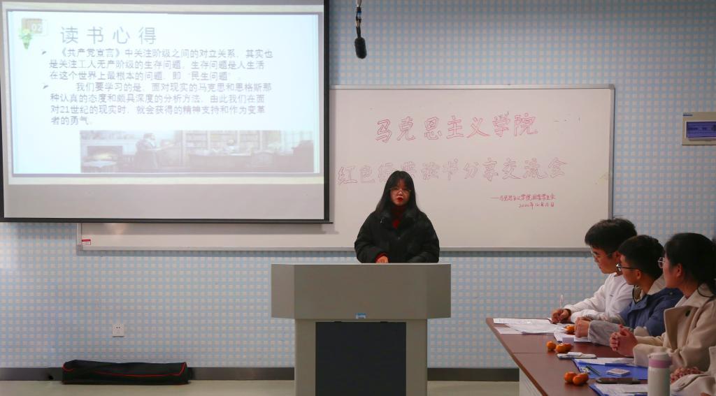 其他组的书目分享同样丰富精彩。第四组采用情景剧形式再现了《红岩》中出身于资产阶级的革命者刘思扬同志的故事,体现出革命不分阶级、革命坚持到底的大无畏精神。第六组分享了《习近平的七年知青岁月》中习近平总书记知青时期爱民为民的故事,鼓励大家从书中去了解领袖的成长经历与故事,汲取思想价值内核与启发。第二组自制音频讲述《共产党宣言》的内容,提出对“剥削”的思考。
