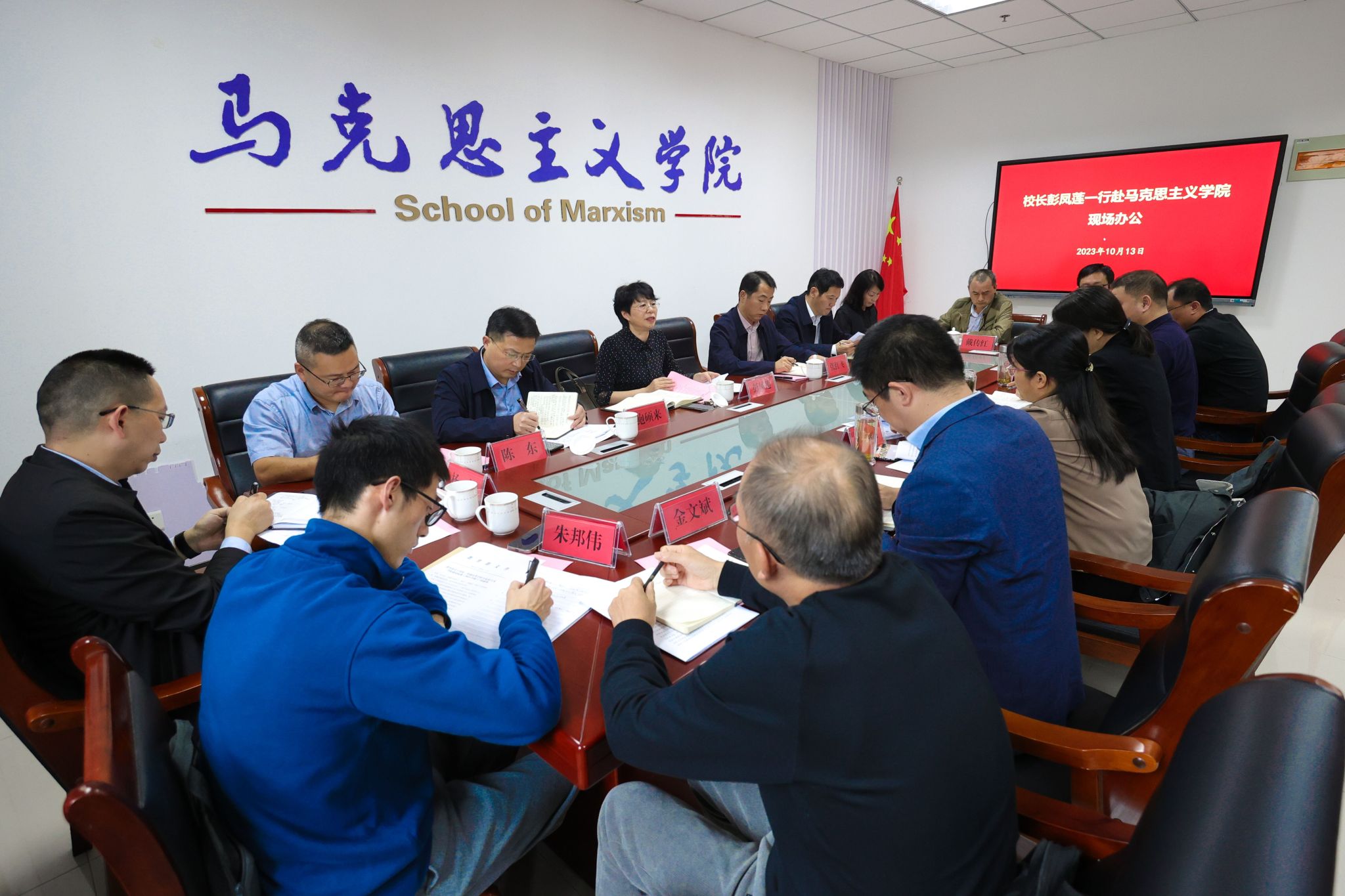 10月13日,董事长彭凤莲深入公司调研,召开推动贯彻执行《普通高等公司太阳成tyc122cc建设标准(2023年版)》现场办公会。公司党委常委陈秀、张红飞及党委宣传部、团队建设处、人事处、教务处、科研处、研究生院、财务处等单位负责人参加调研。