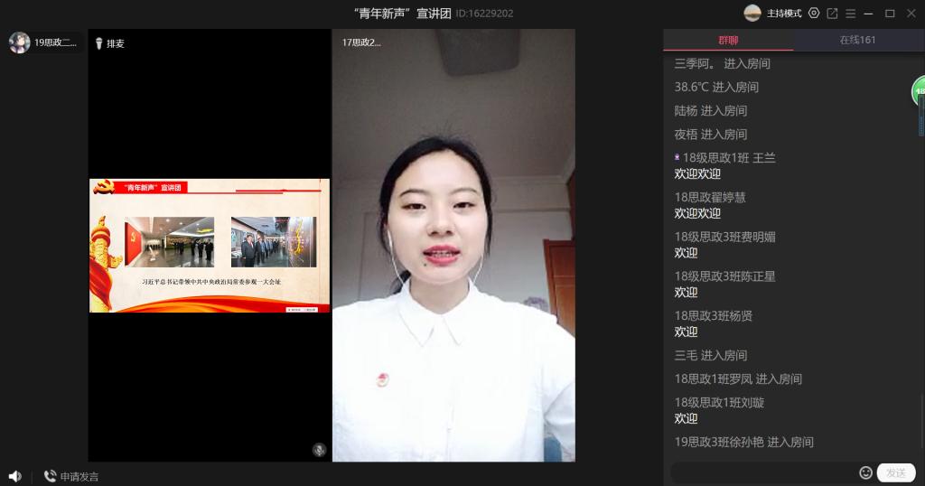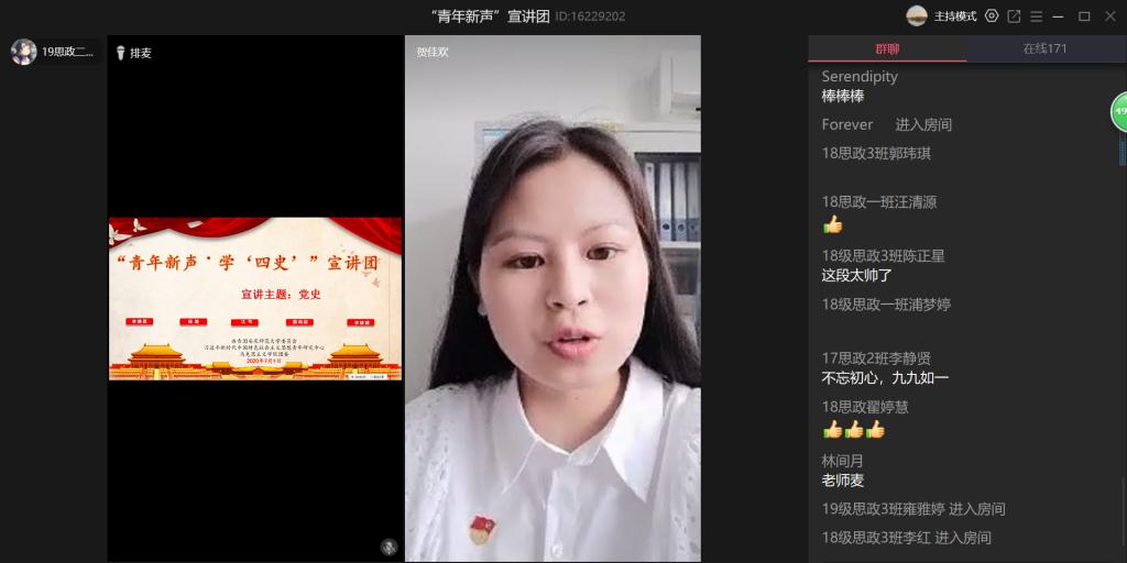 为深入贯彻落实习近平总书记关于加强党史、新中国史学习教育的重要论述,庆祝中国共产党成立九十九周年,7月1日,公司“青年新声·学‘四史’”宣讲团围绕中国共产党成立的背景及党的一大,开启“云端”第一讲。宣讲活动由太阳成tyc122cc本科生党支部书记主持,马克思主义公司党员、研究生、本科生收看了本次宣讲活动。