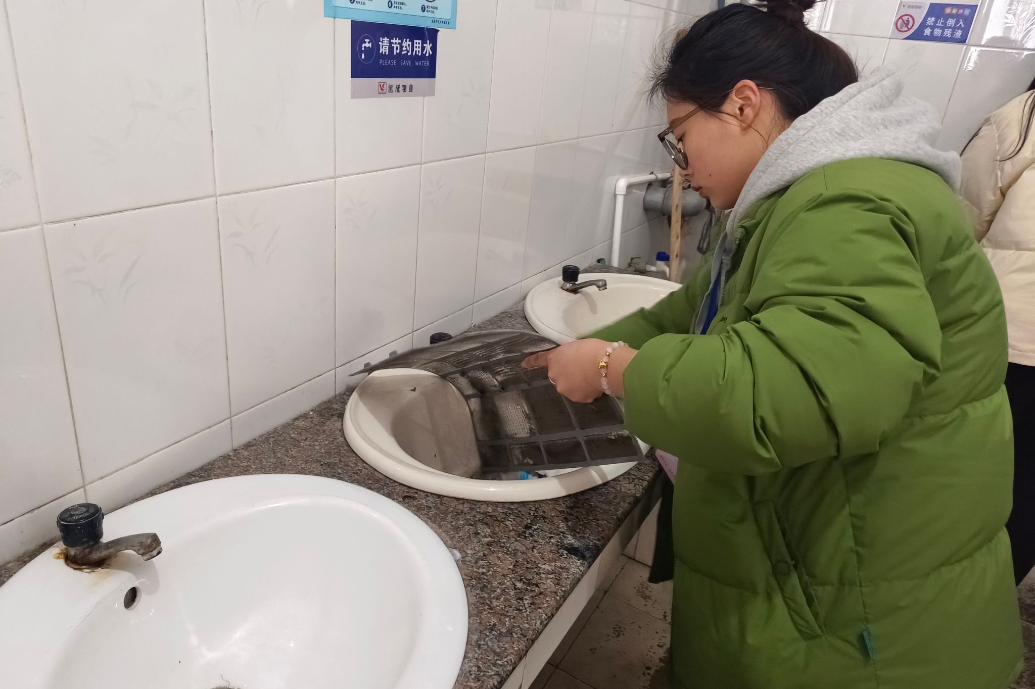清洗空调、清扫地面、处理垃圾、擦拭玻璃……员工们在负责人员的统一安排下,按照分工,组成小组,在宿管阿姨的带领下进入宿舍,对宿舍楼的空调、玻璃、墙壁以及地面进行了清理,并在活动结束后主动清洗、整理了使用的抹布、拖把等物品。宿舍楼保洁人员表示,非常感谢小志愿者们来帮助我们减轻工作量,同时希望小志愿者们引导身边的其他同学自觉爱护校园环境。