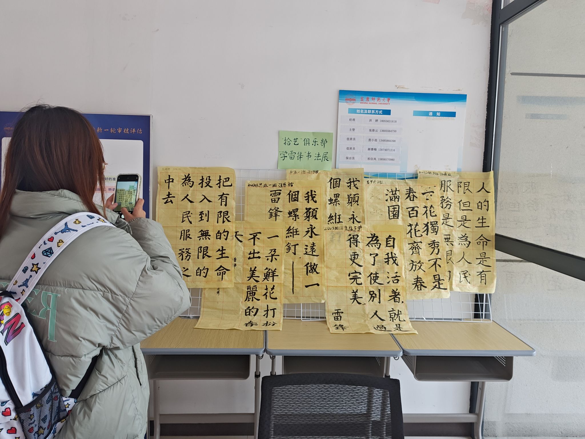 遒劲端正的楷书、活泼有神的行书、放荡不羁的草书……桌上摆放着各式字体的书法作品,引来了员工们的驻足围观和拍照纪念。活动负责人、思想政治教育专业2022级(2)班罗慧柳介绍,这些作品都是由公司“拾艺”俱乐部成员誊写,工作人员提前一周收集并挑选出优秀作品进行展示,“此次书法展为同学们提供了一次充分展现自我的平台,以及热爱祖国、甘于奉献的崇高理想和坚定信念。”